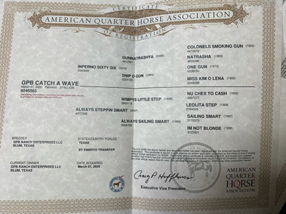 Description: This gorgeous colt has it all! Sunny looks the part with all the color and bling that one can ask for in a yearling. He is athletic, good-minded, and should make a great open prospect. This one has it all and has had the groundwork to boot. He has been tied, hobbled, hooked up in the round pen, sacked out, roped, lounged, had his feet picked up, ponied, saddled, and carried a bridle. He stands good for the farrier, ties, leads, and has no vices. Sunny is sired by the outstanding Stallion Inferno Sixty Six (NRHA earnings $210,000 and NRHA Futurity Res. Champion) and out of our great Mare Always Steppin Smart. Always Steppin Smart is by Wimpys Little Step (PE 7 million+) and out of the Great Mare Always Sailing Smart (NRHA 37,000, PE $60,000+). Always Steppin' Smart has produced great offspring including Xtra Black Magic and Xtra Steppin Voodoo (currently being shown by Matt Mills). Blue blood runs throughout GPB Catch A Waves pedigree. He sells December 2, 2021, in the NRHA Markel Elite Yearling Sale, Lot #65.